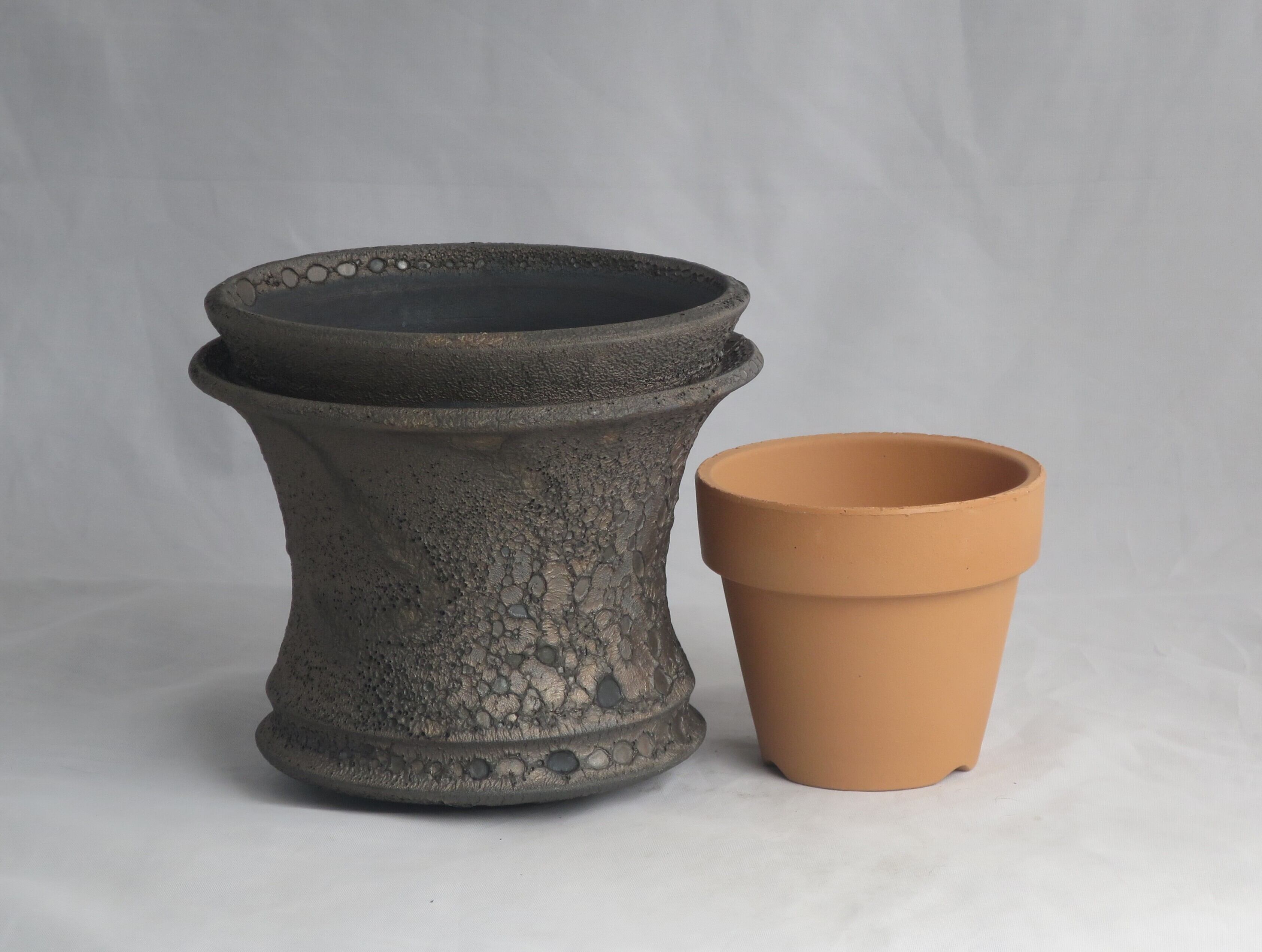 この植木鉢は、金と黒が混ざり合う輝きに、鋭い質感を持つクレーターのような表面を重ね、