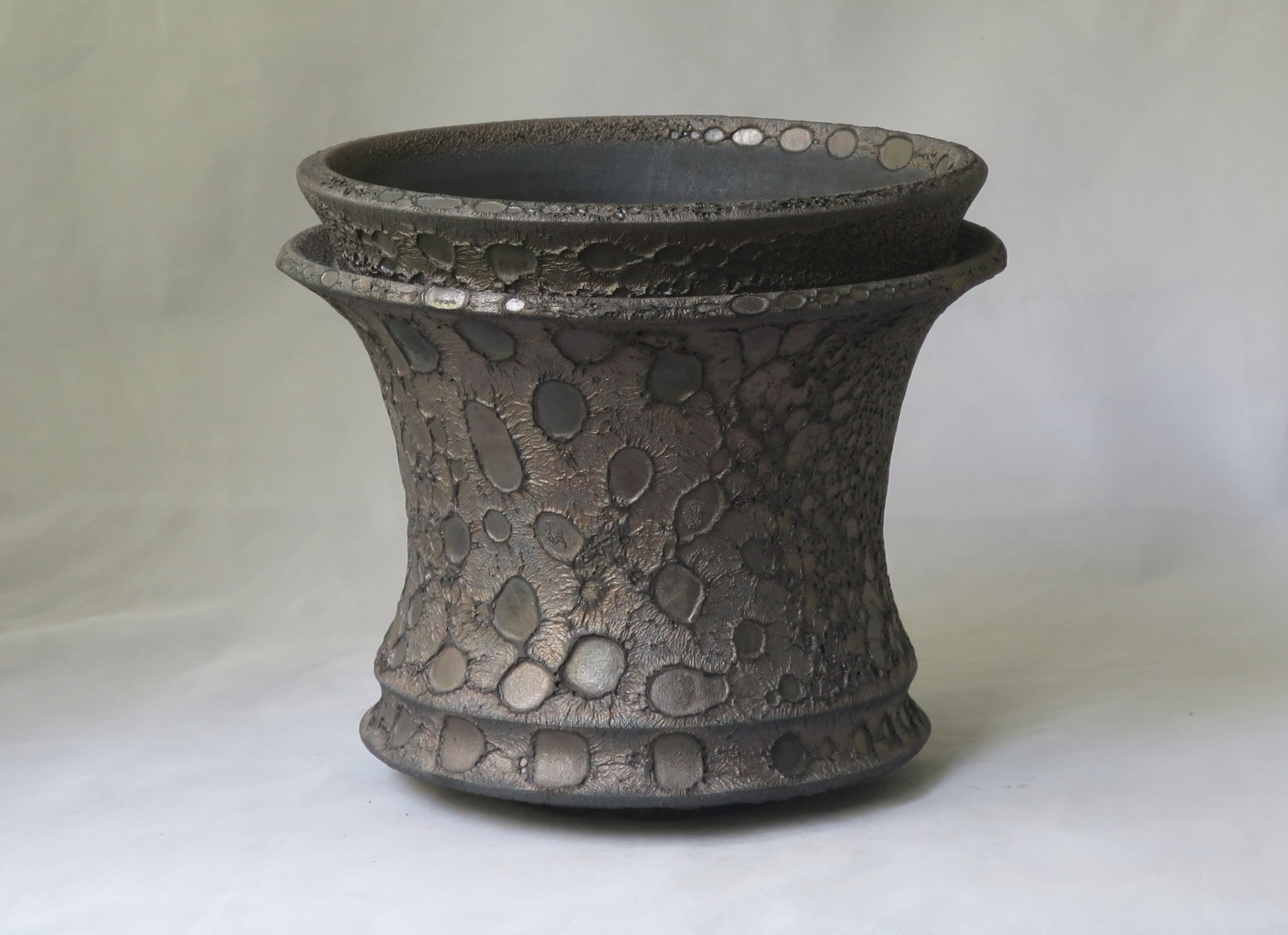 焼き上がりには、黒や金のマットな質感やクレーター状の凹凸など、多彩で力強い表情が現れます。