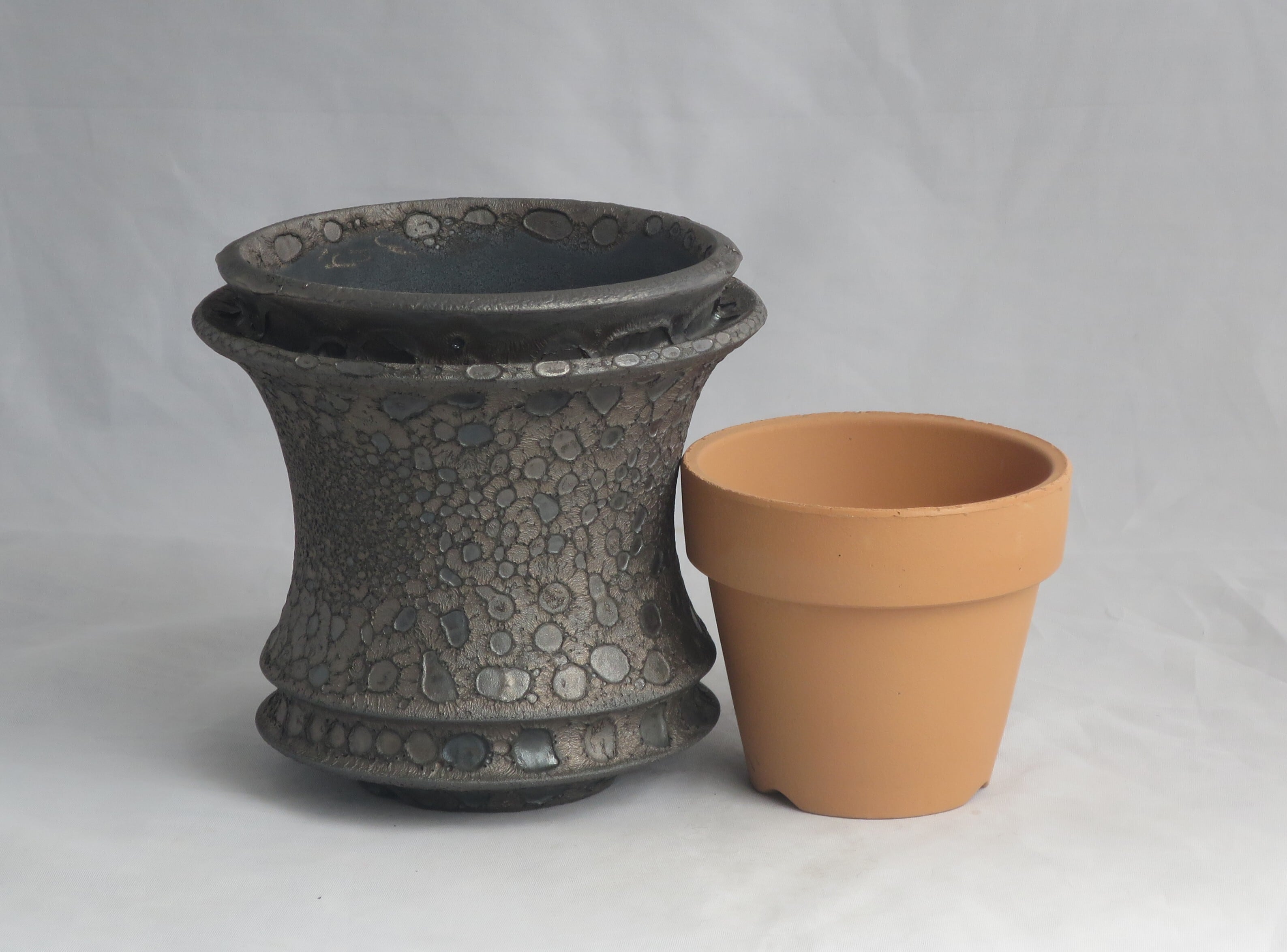 この植木鉢は、金と黒が混ざり合う輝きに、鋭い質感を持つクレーターのような表面を重ね、