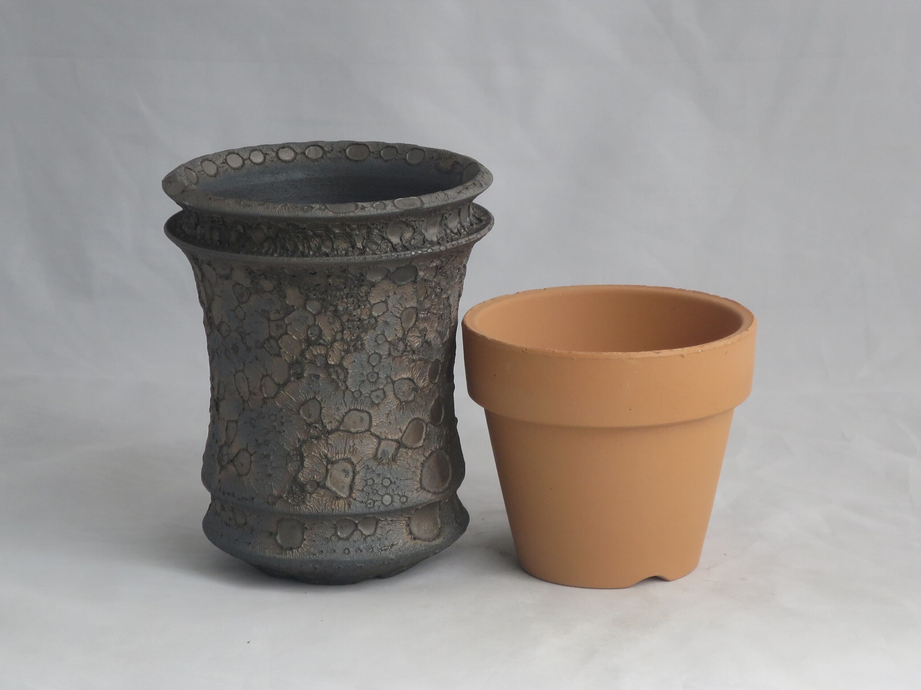 この植木鉢は、金と黒が混ざり合う輝きに、鋭い質感を持つクレーターのような表面を重ね、