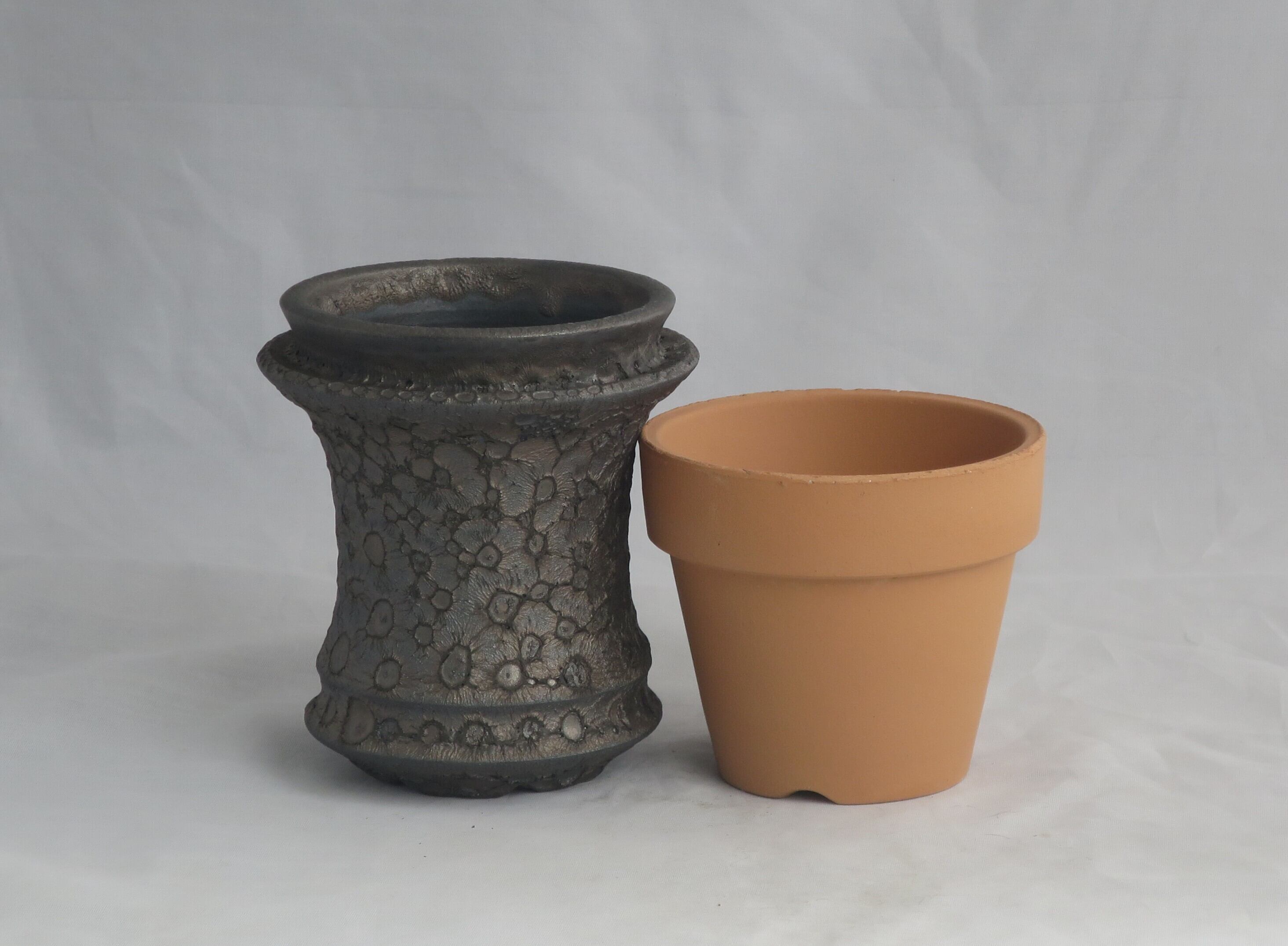 この植木鉢は、金と黒が混ざり合う輝きに、鋭い質感を持つクレーターのような表面を重ね、