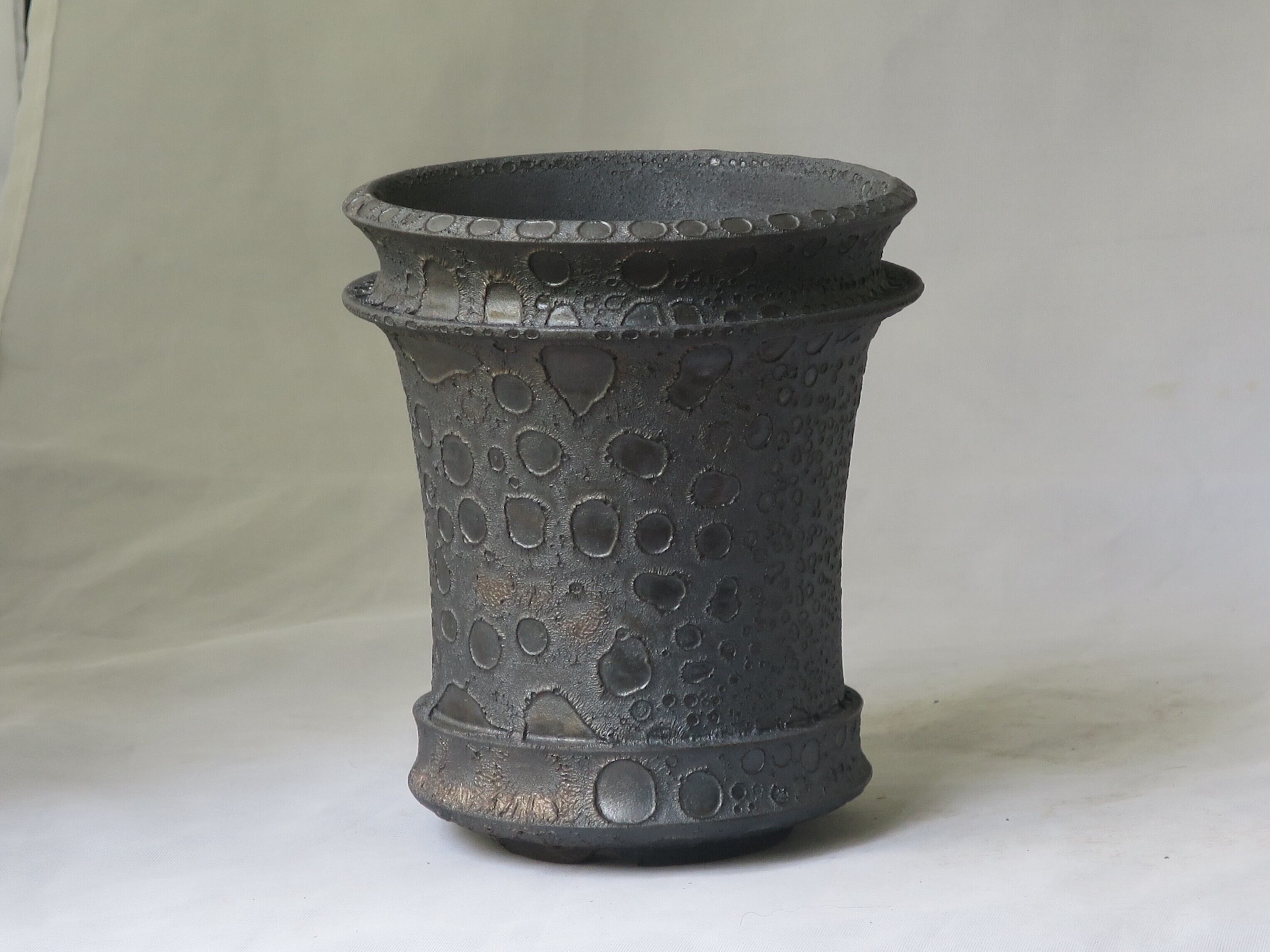 この植木鉢は、金と黒が混ざり合う輝きに、鋭い質感を持つクレーターのような表面を重ね、