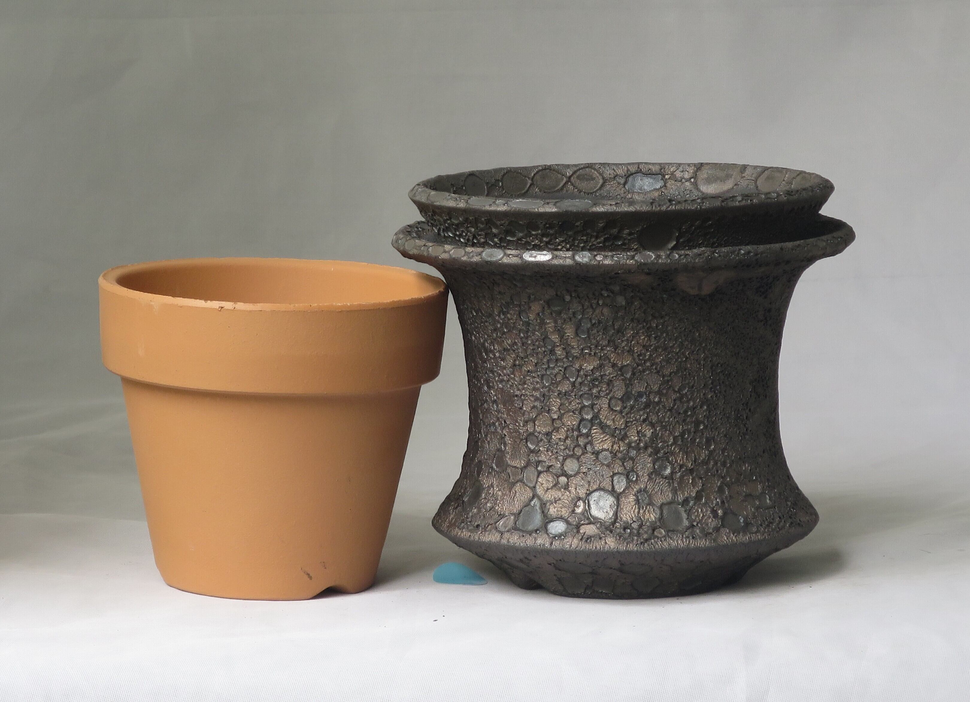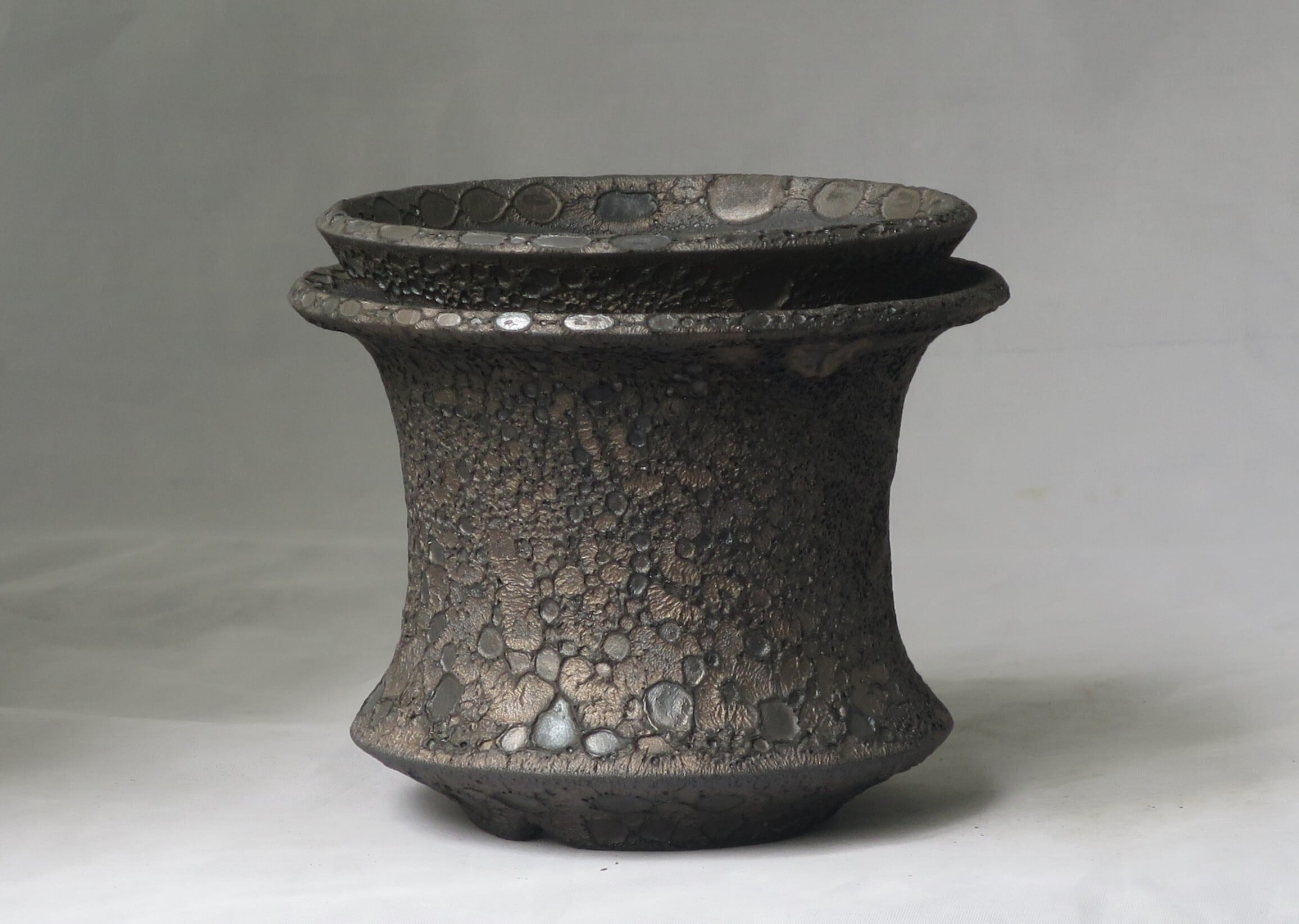 この植木鉢は、金と黒が混ざり合う輝きに、鋭い質感を持つクレーターのような表面を重ね、