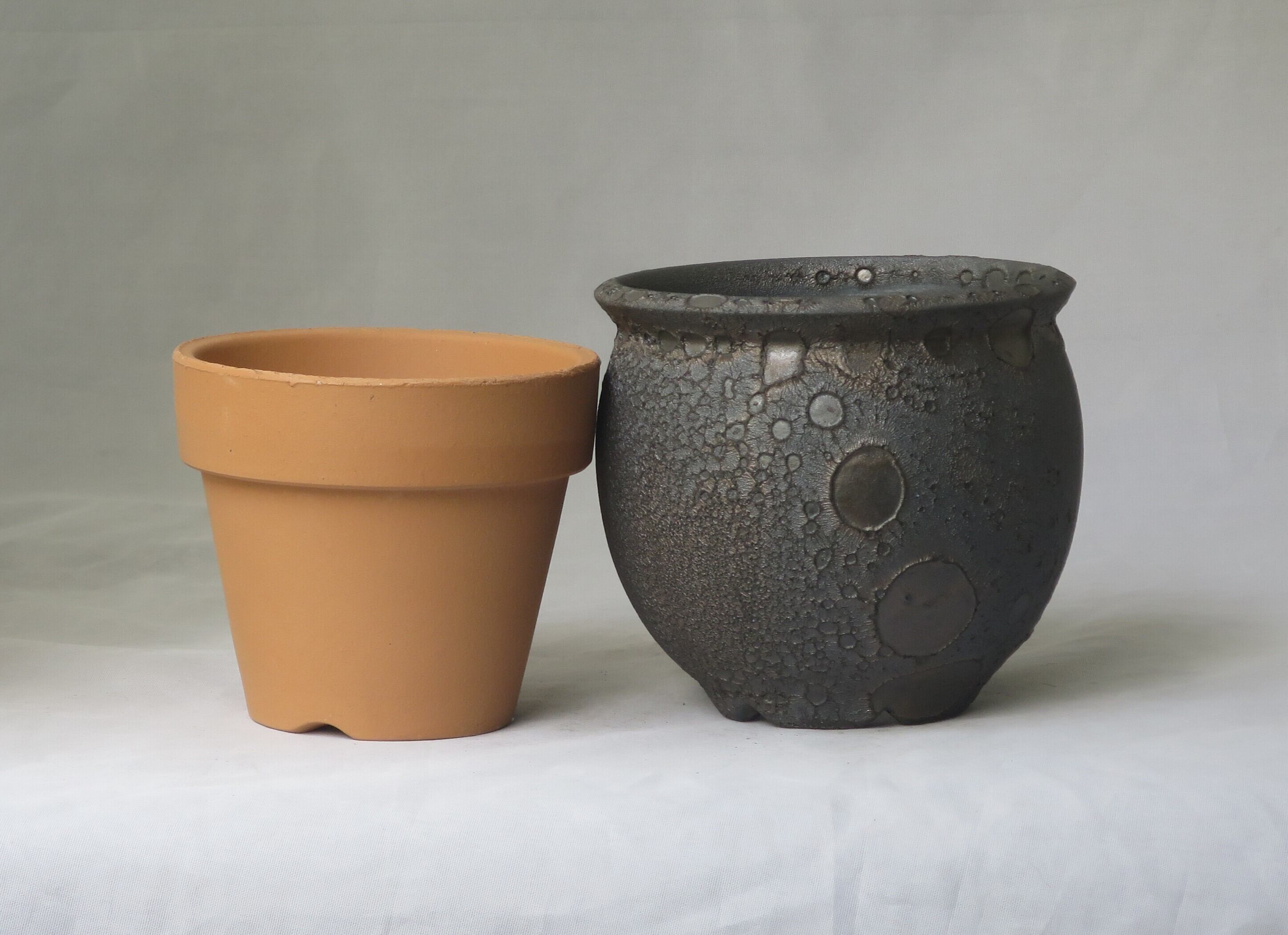 この植木鉢は、金と黒が混ざり合う輝きに、鋭い質感を持つクレーターのような表面を重ね、