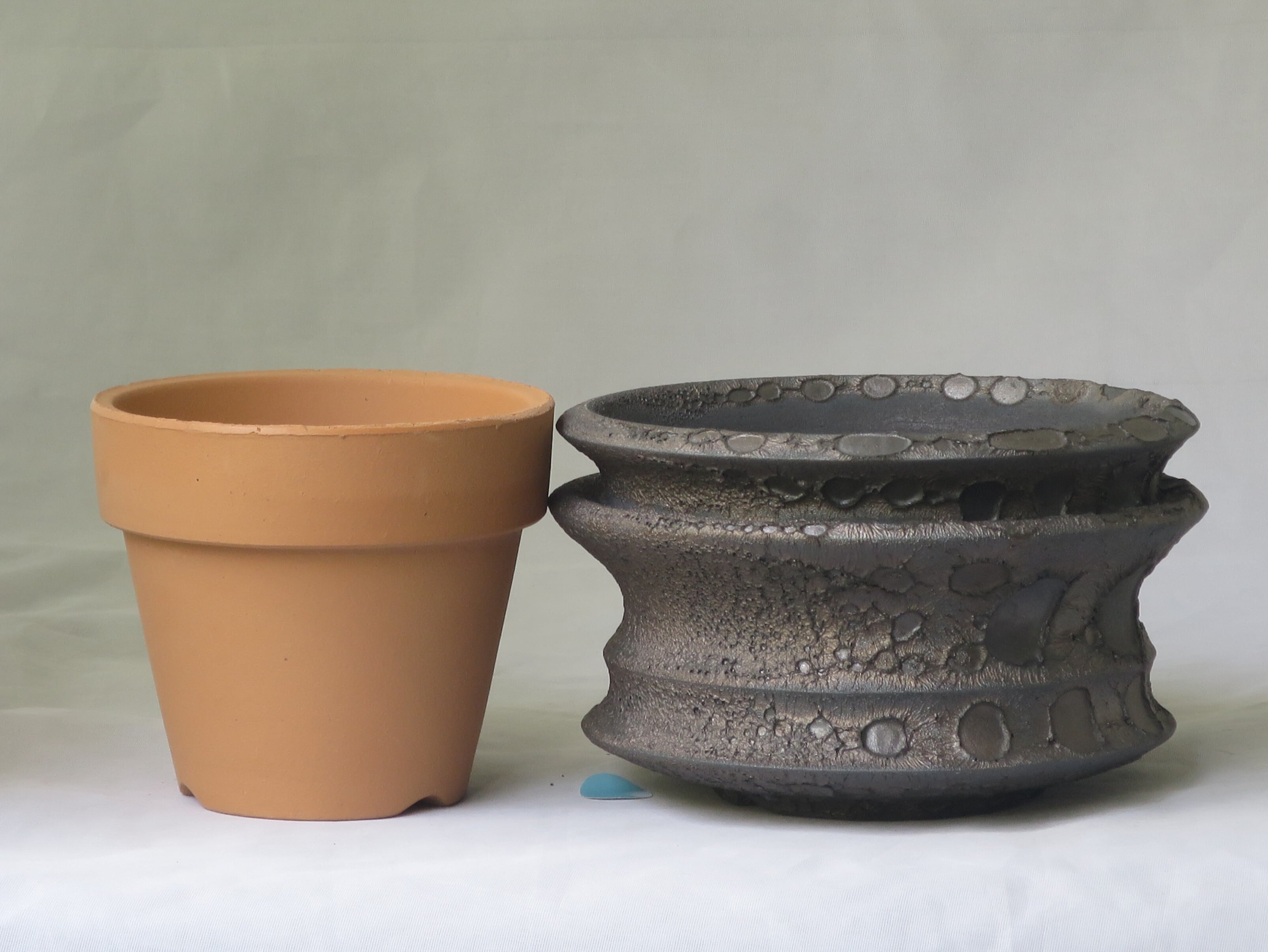 この植木鉢は、金と黒が混ざり合う輝きに、鋭い質感を持つクレーターのような表面を重ね、