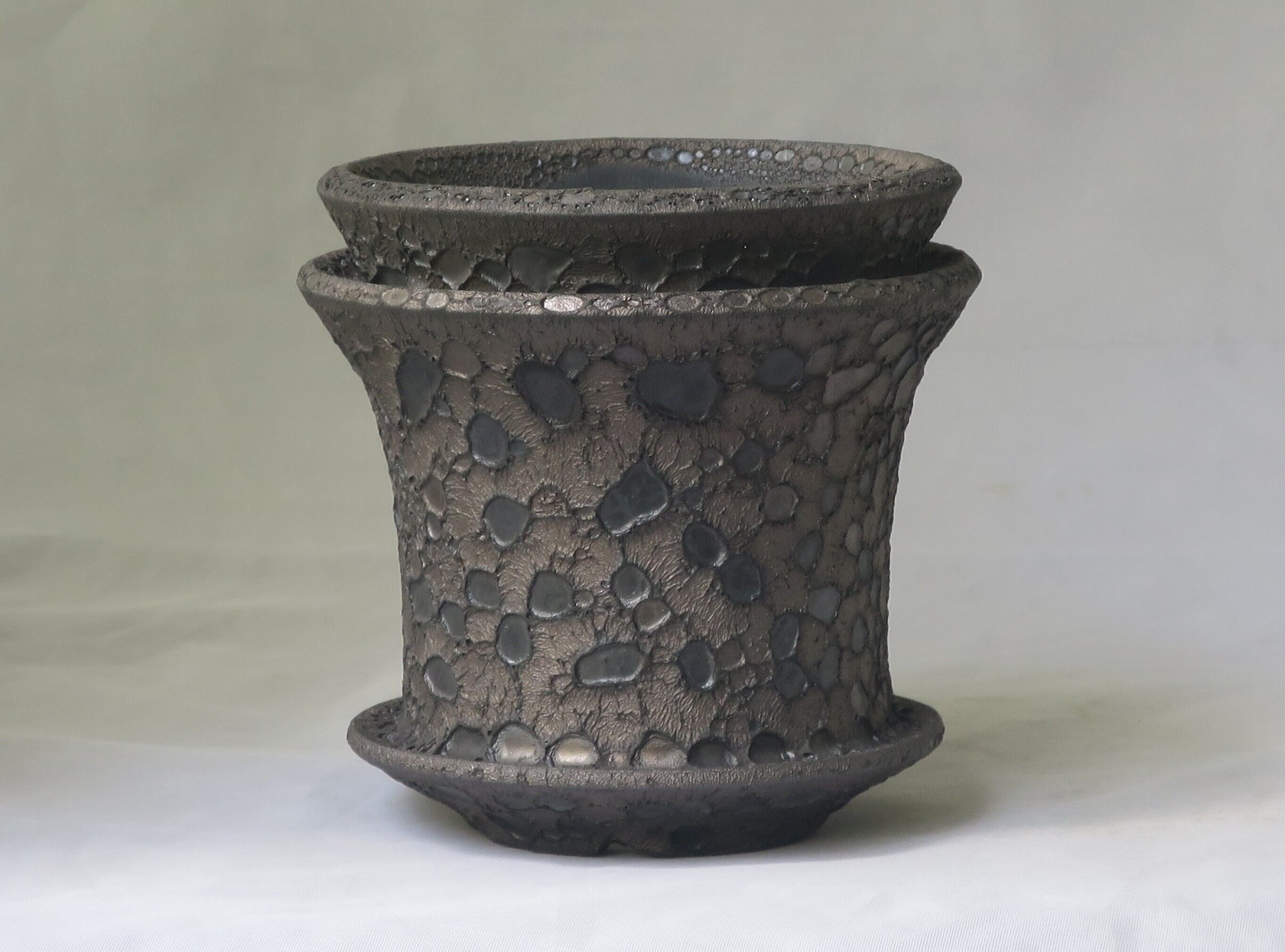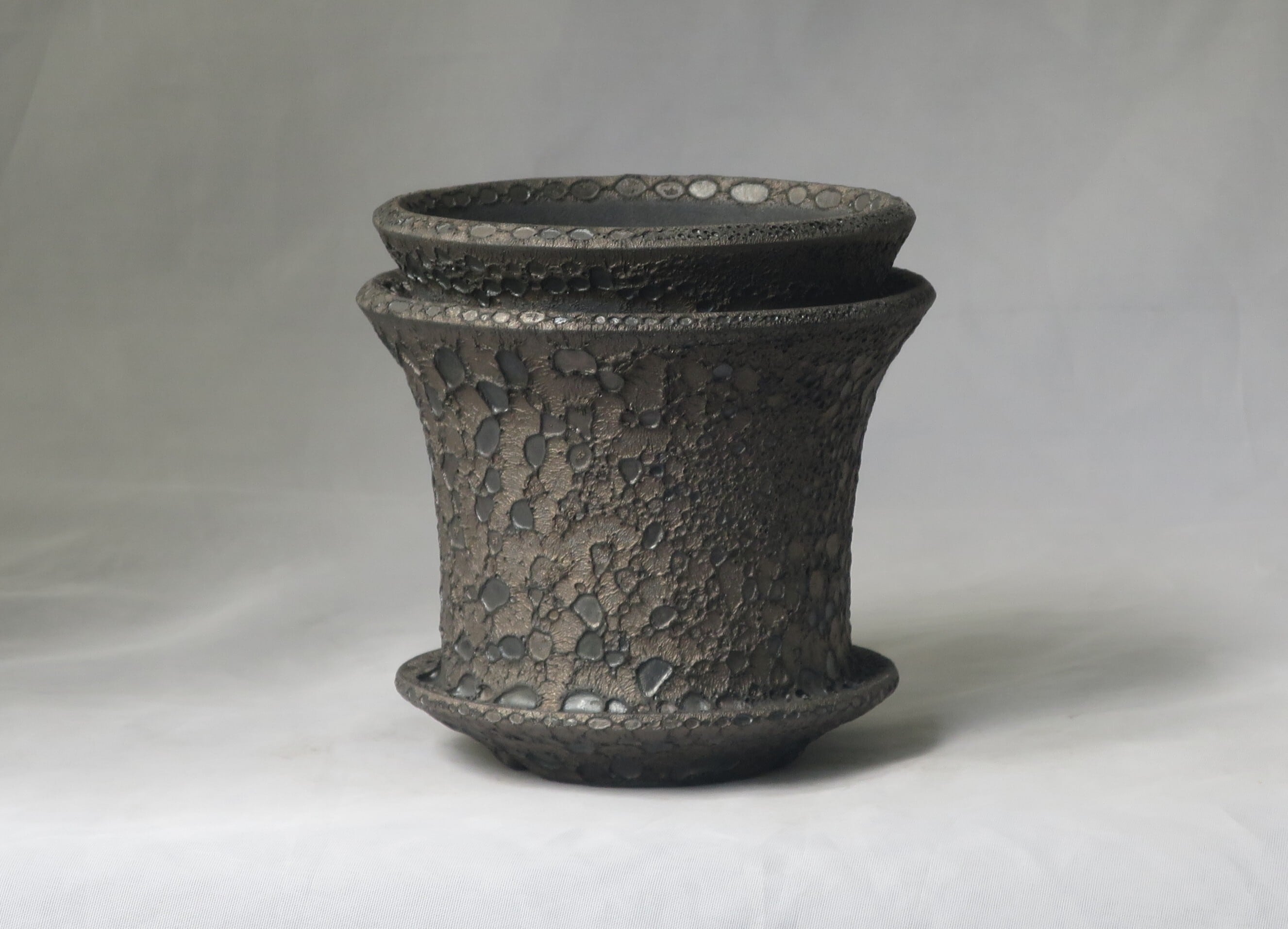 この植木鉢は、金と黒が混ざり合う輝きに、鋭い質感を持つクレーターのような表面を重ね、