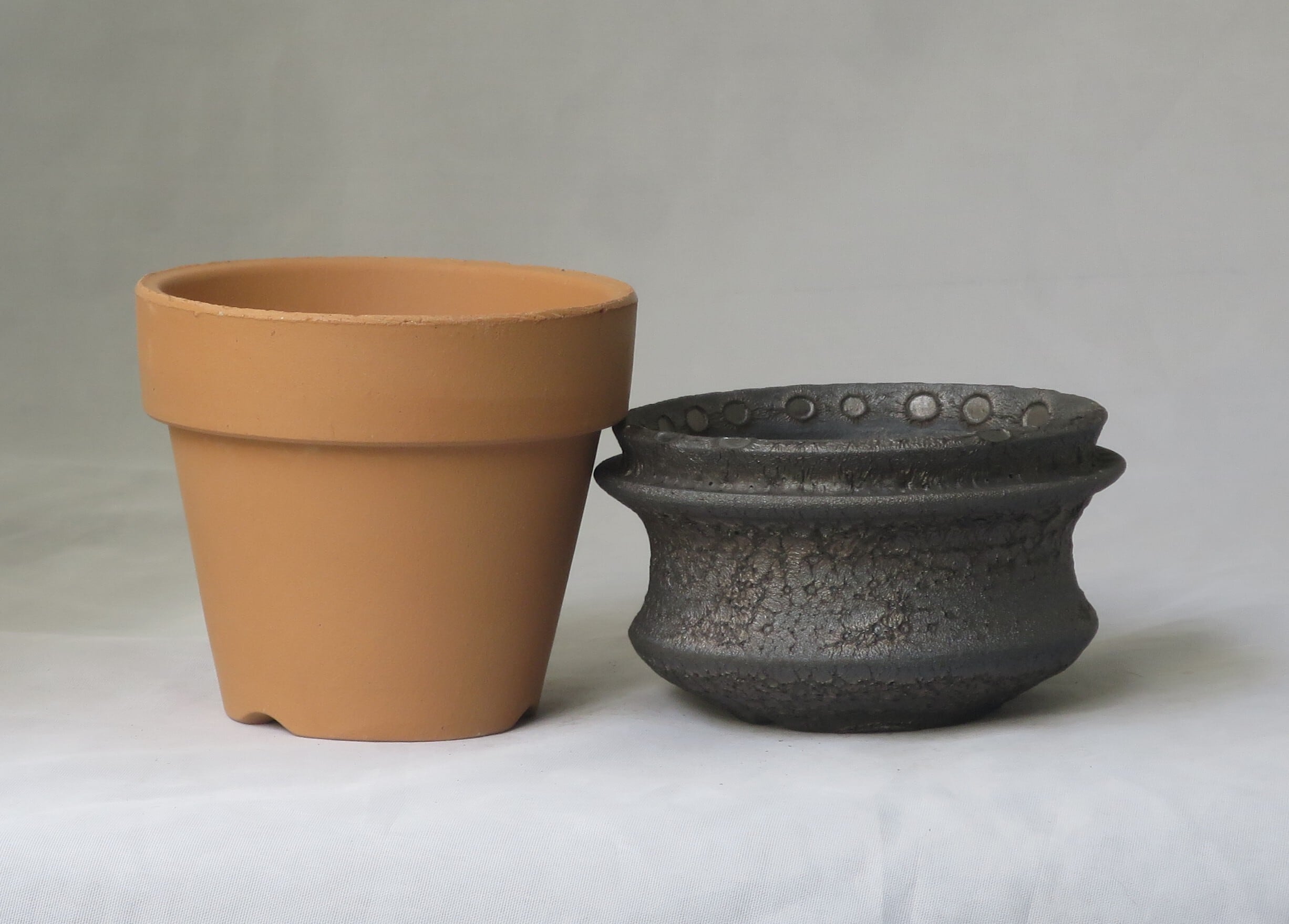 サイズ比較用に映っている素焼きポットは「3号サイズ(外径9.5cm × 高さ8.3cm)」です。