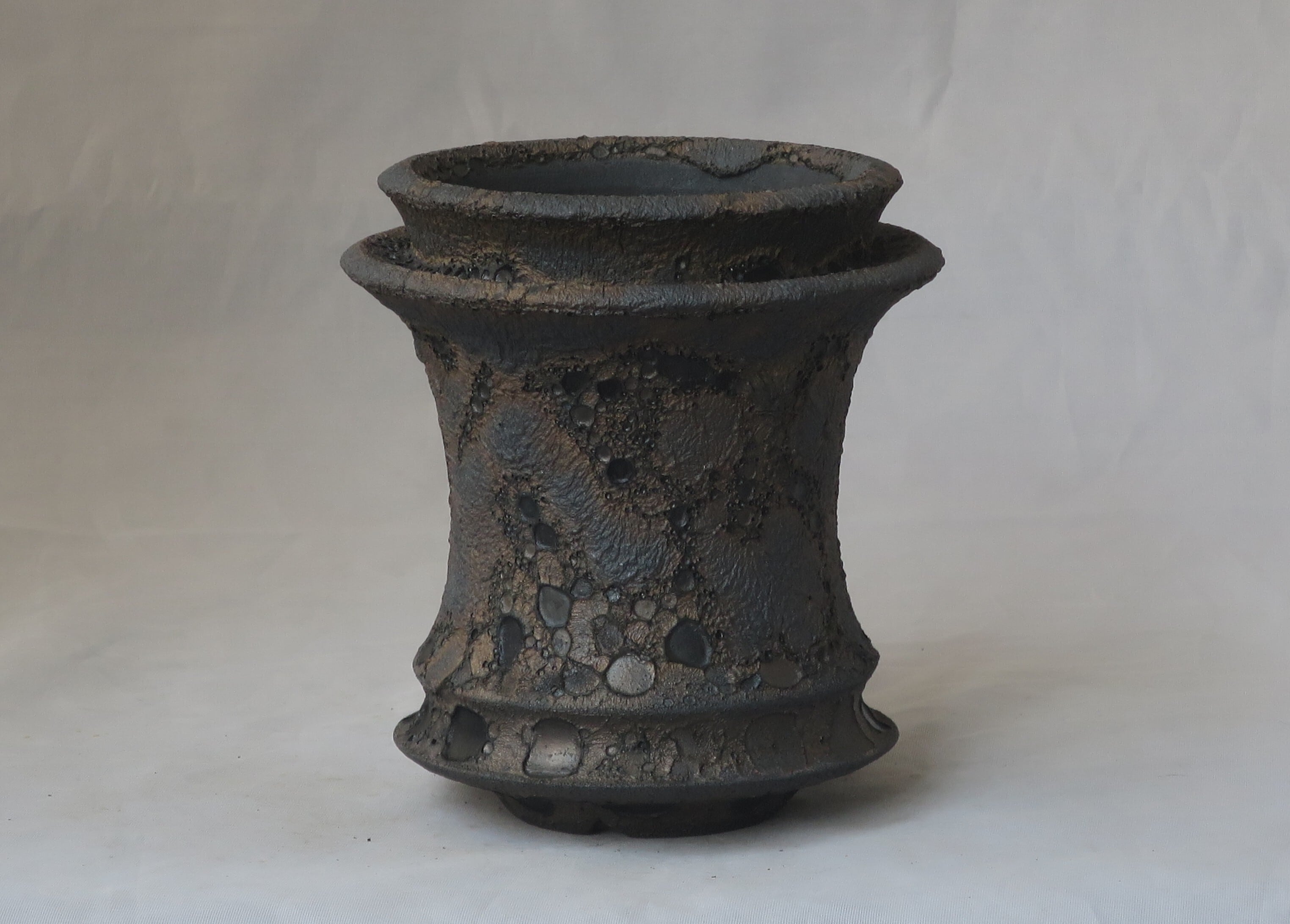 この植木鉢は、金と黒が混ざり合う輝きに、鋭い質感を持つクレーターのような表面を重ね、