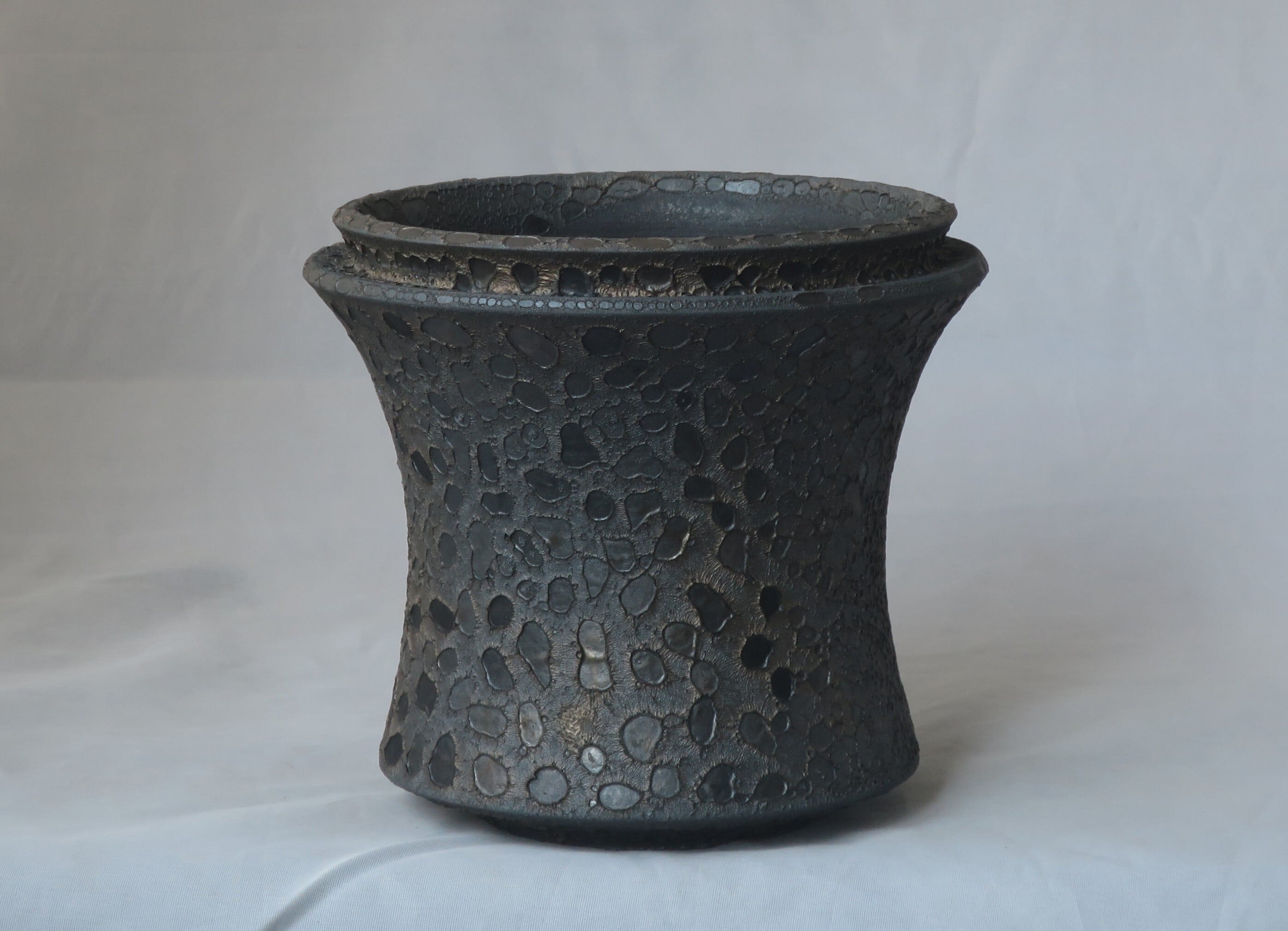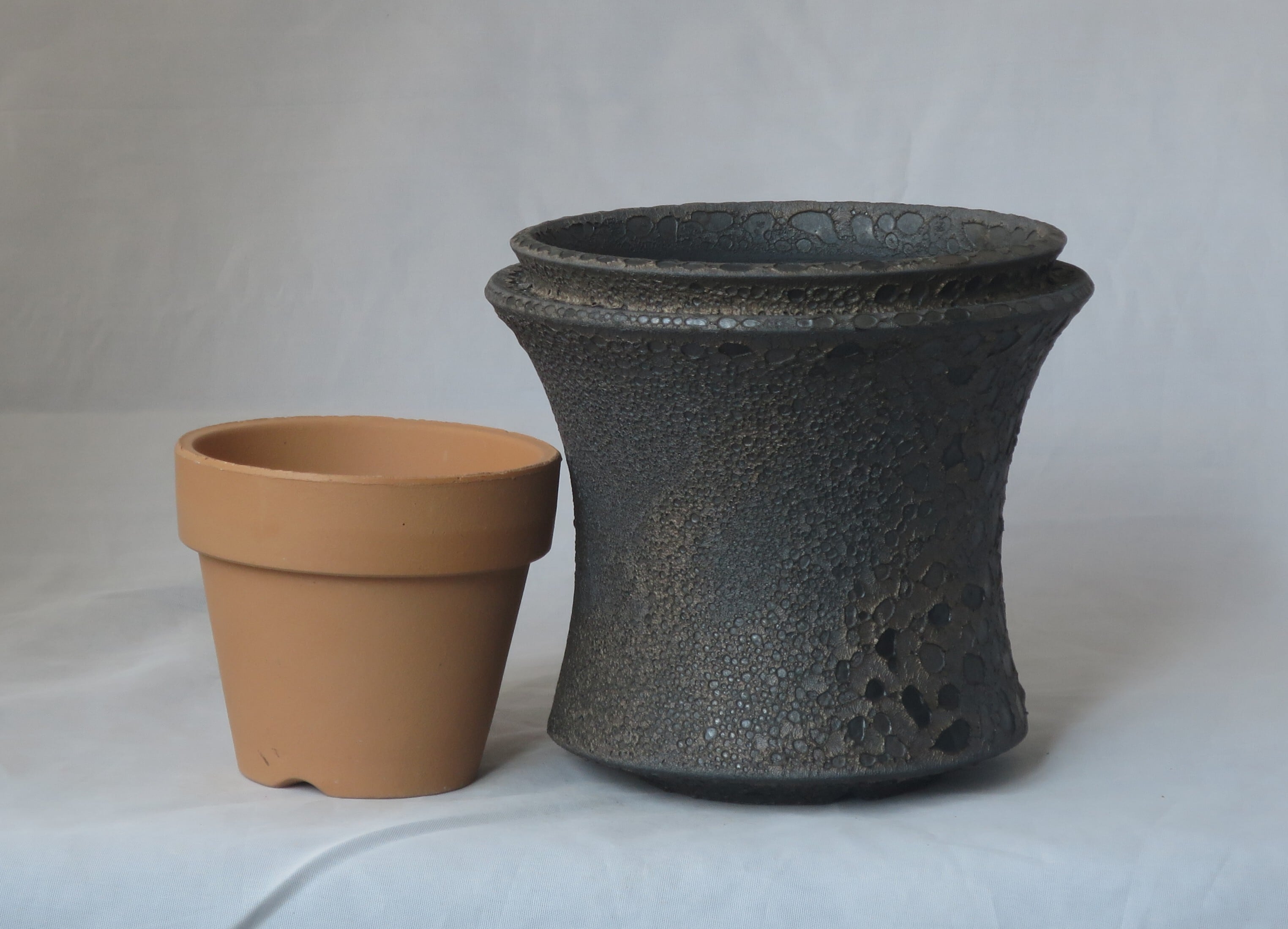この植木鉢は、金と黒が混ざり合う輝きに、鋭い質感を持つクレーターのような表面を重ね、