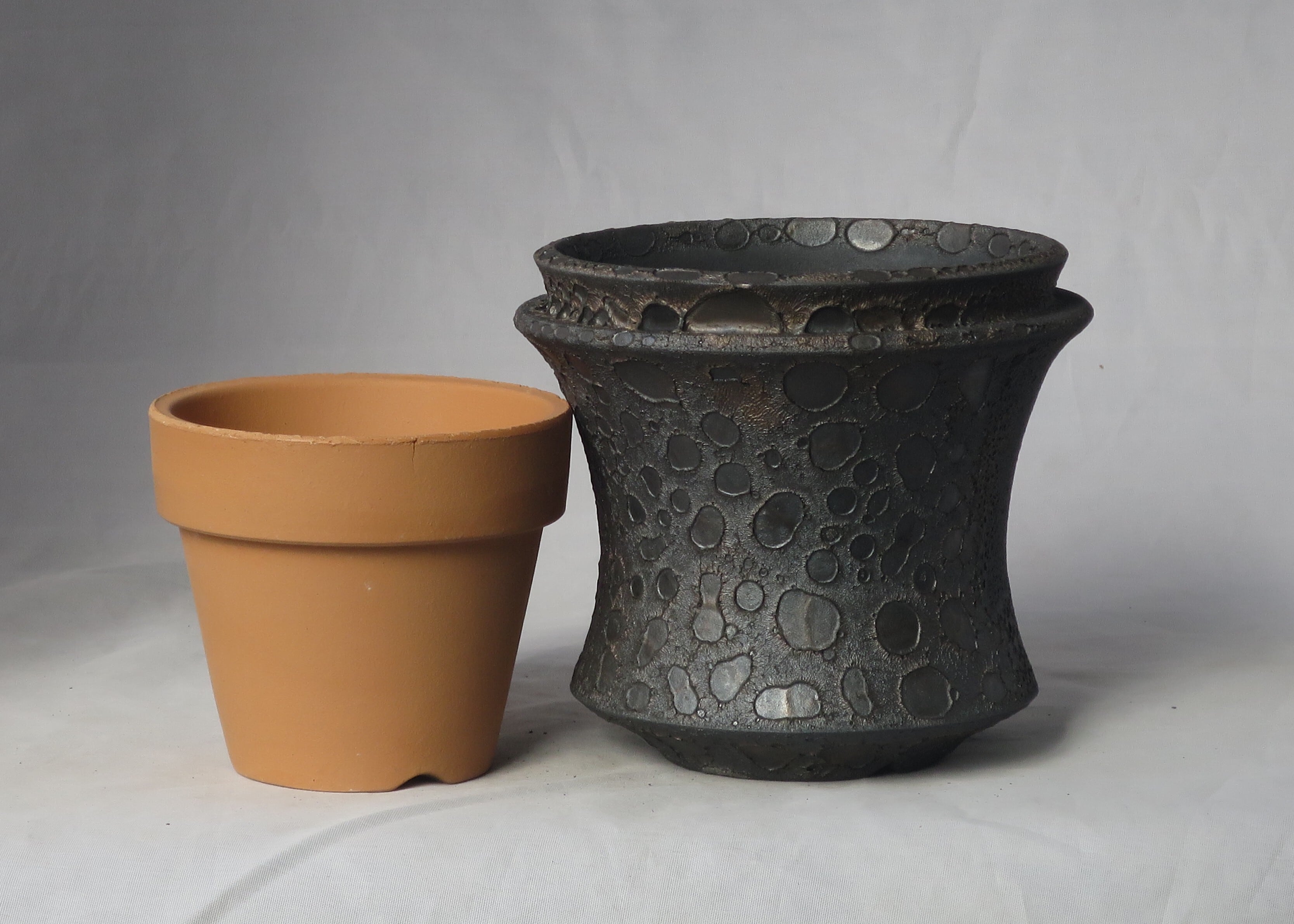 この植木鉢は、金と黒が混ざり合う輝きに、鋭い質感を持つクレーターのような表面を重ね、