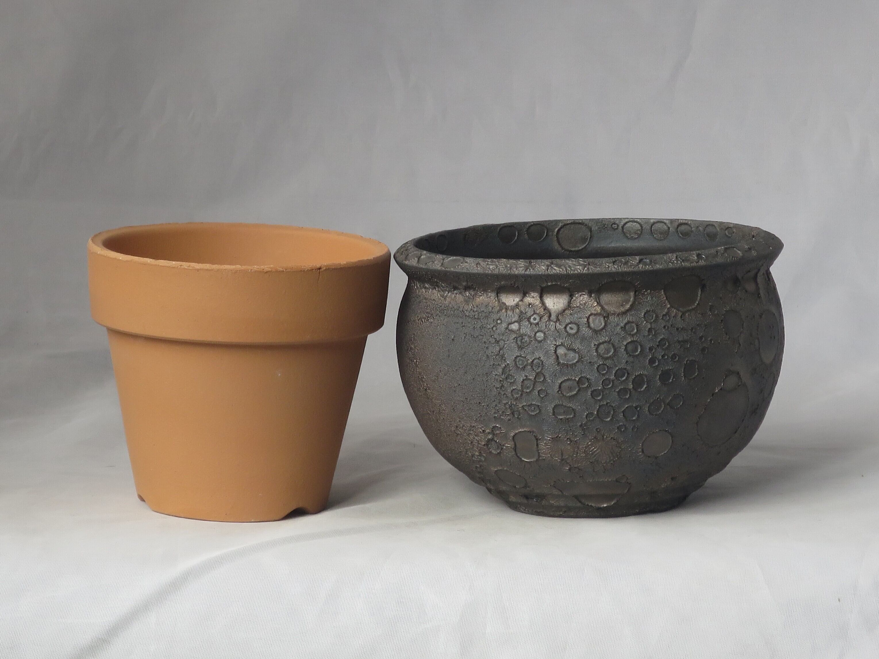 この植木鉢は、金と黒が混ざり合う輝きに、鋭い質感を持つクレーターのような表面を重ね、