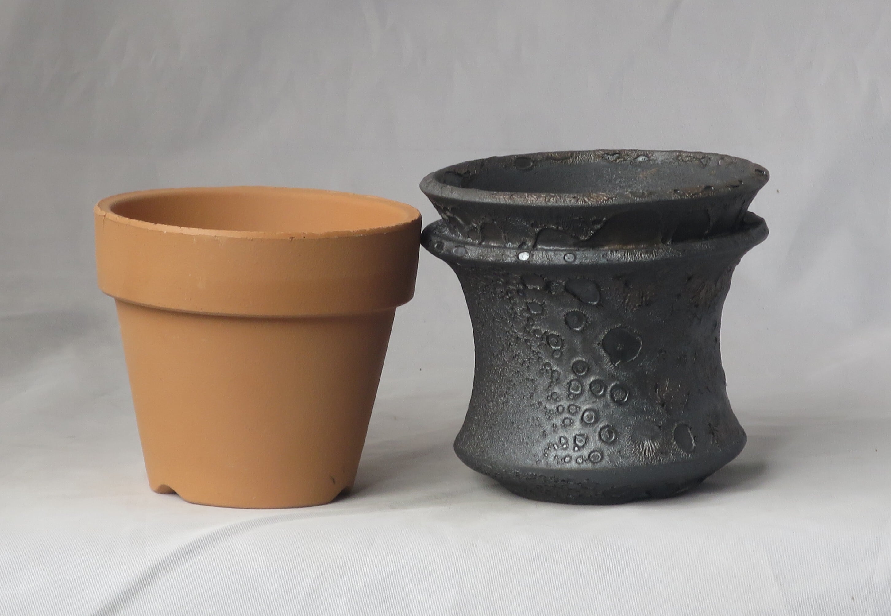 この植木鉢は、金と黒が混ざり合う輝きに、鋭い質感を持つクレーターのような表面を重ね、
