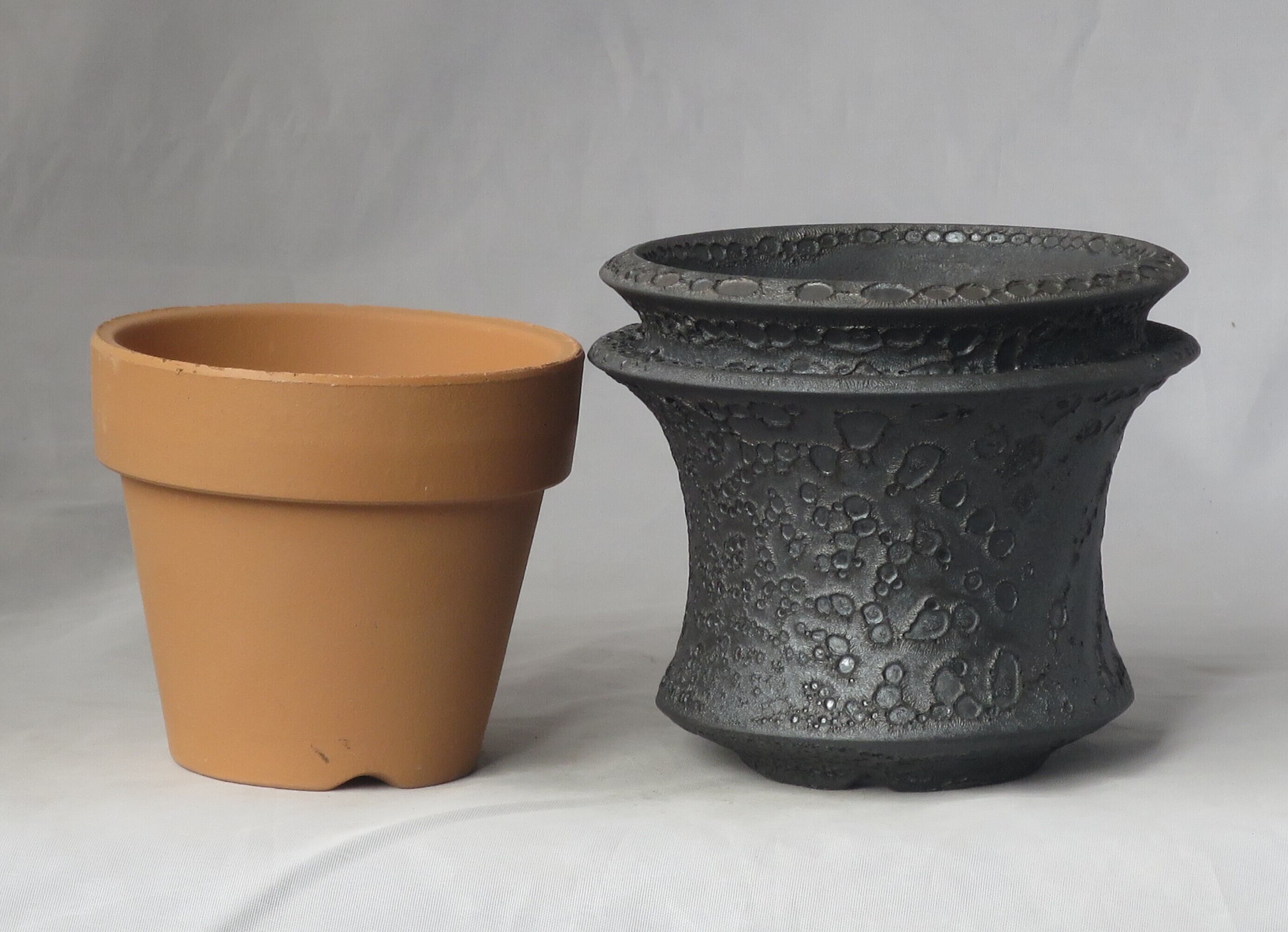 この植木鉢は、金と黒が混ざり合う輝きに、鋭い質感を持つクレーターのような表面を重ね、
