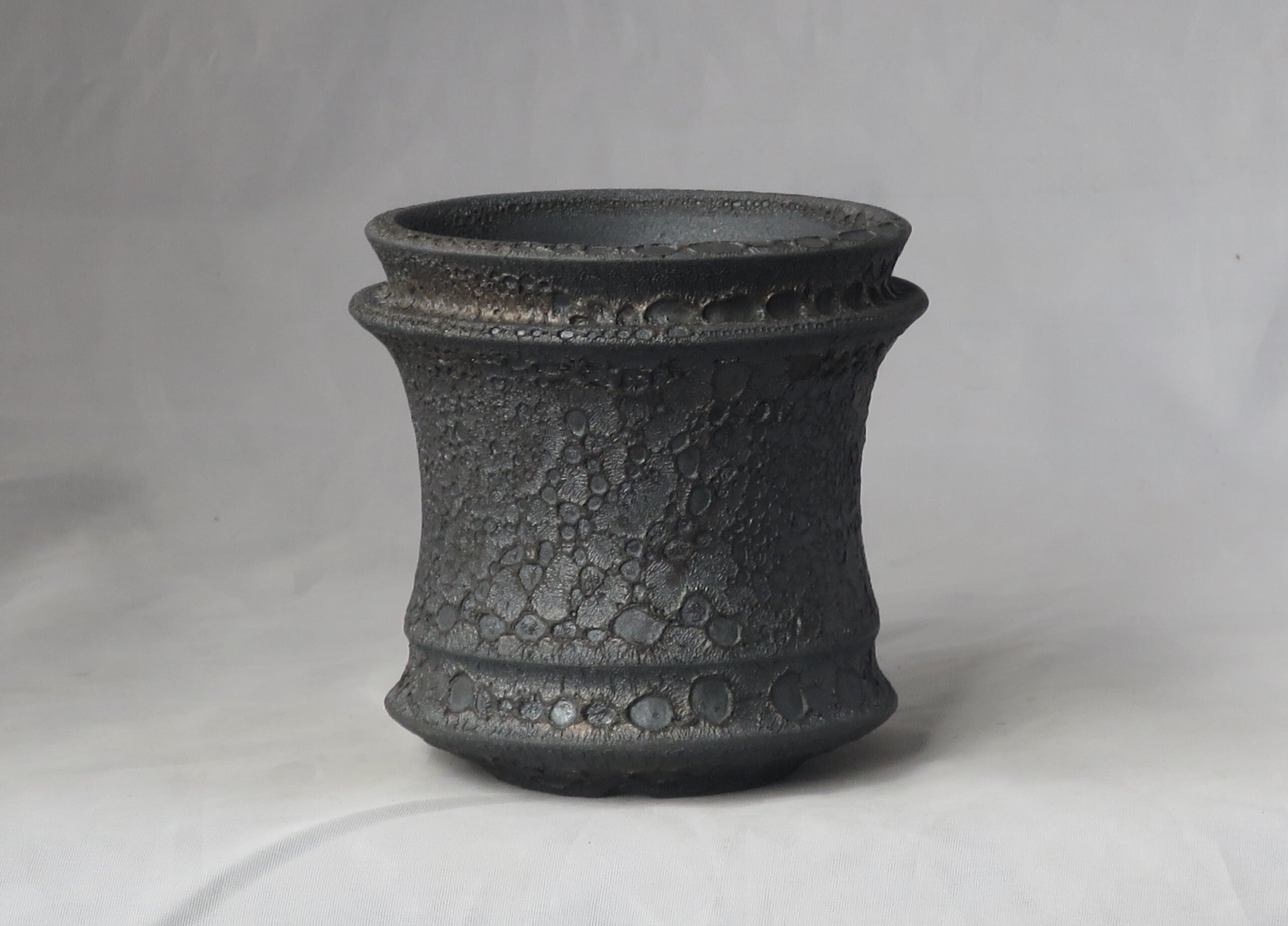 この植木鉢は、金と黒が混ざり合う輝きに、鋭い質感を持つクレーターのような表面を重ね、
